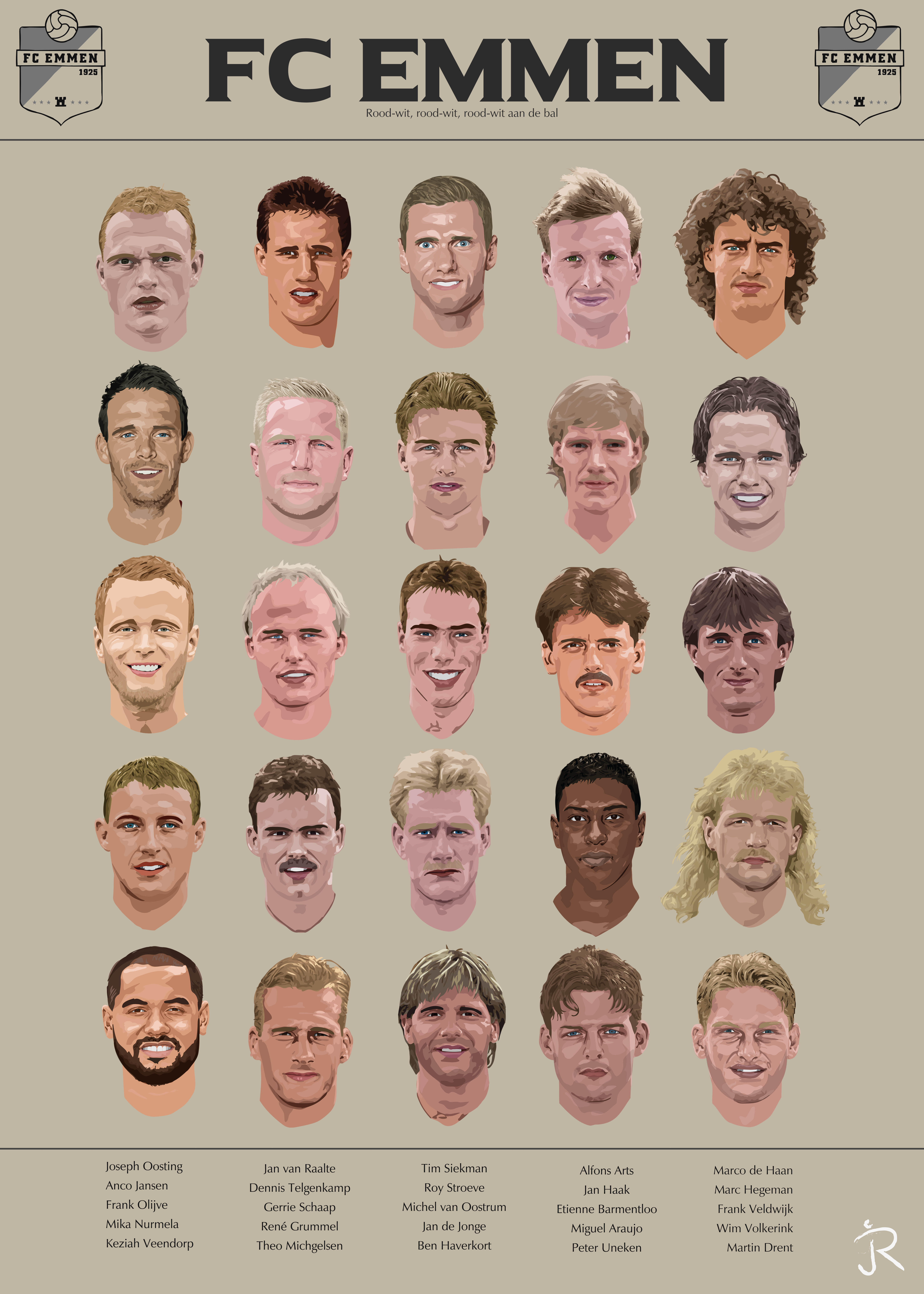 Iedere FC Emmen-supporter zal meteen wegdromen bij het zien van de gezichten van oude en meer recente helden van de club. Naast iconen als Jan Haak, Jan de Jonge en Ben Haverkort is er ook ruimte voor de helden van eind jaren 90 die jaar-in-jaar-uit knokten voor promotie. Dan hebben we het onder meer over clubtopscorer allertijden Michel van Oostrum, Martin Drent, Joseph Oosting, Mika Nurmela en René Grummel.