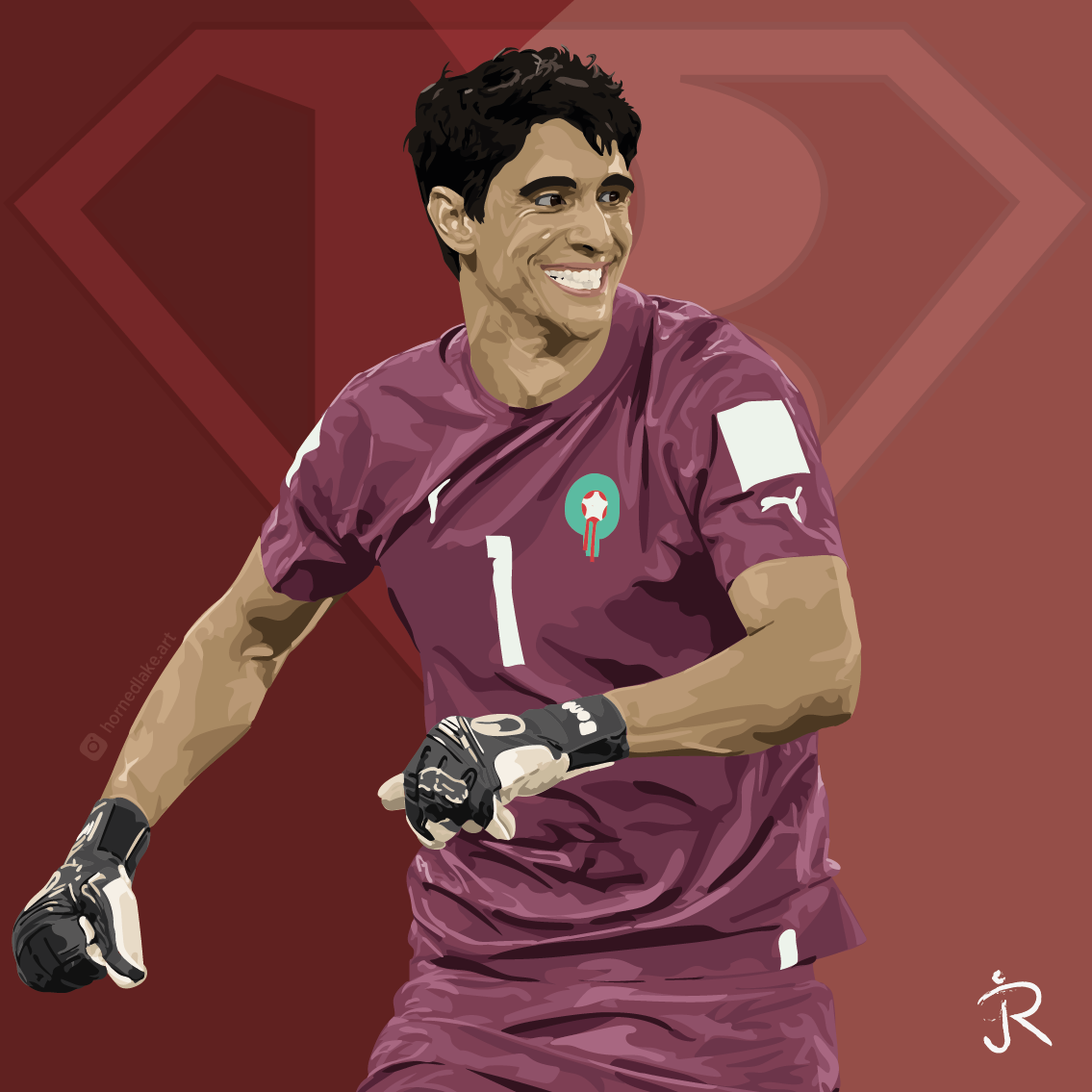 Eén van Marokko’s grootste helden van het WK 2022 was keeper ‘Bono’. Op deze Yassine Bounou print kun je zijn fantastische prestatie tijdens de penaltyserie tegen Spanje nog eens beleven. “Bono” zag de eerste bal op de paal gaan en pakte de volgende twee penalties waardoor Marokko naar de kwartfinale van het WK ging.